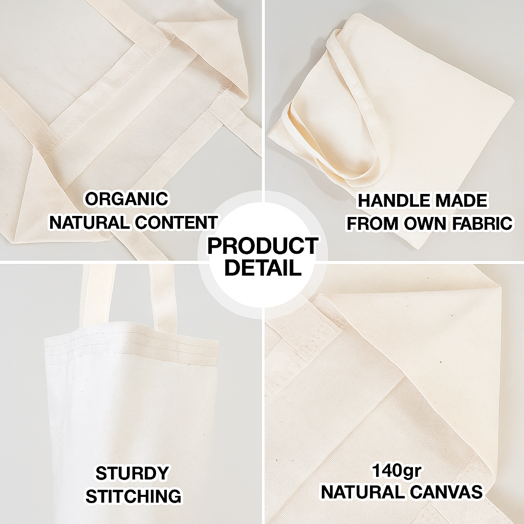 Discover our premium blank tote bag made from 100% natural raw cotton canvas (140 gsm). Designed for sustainability and everyday practicality, this lightweight yet sturdy bag is ideal for daily use, DIY printing, embroidery, or event giveaways.